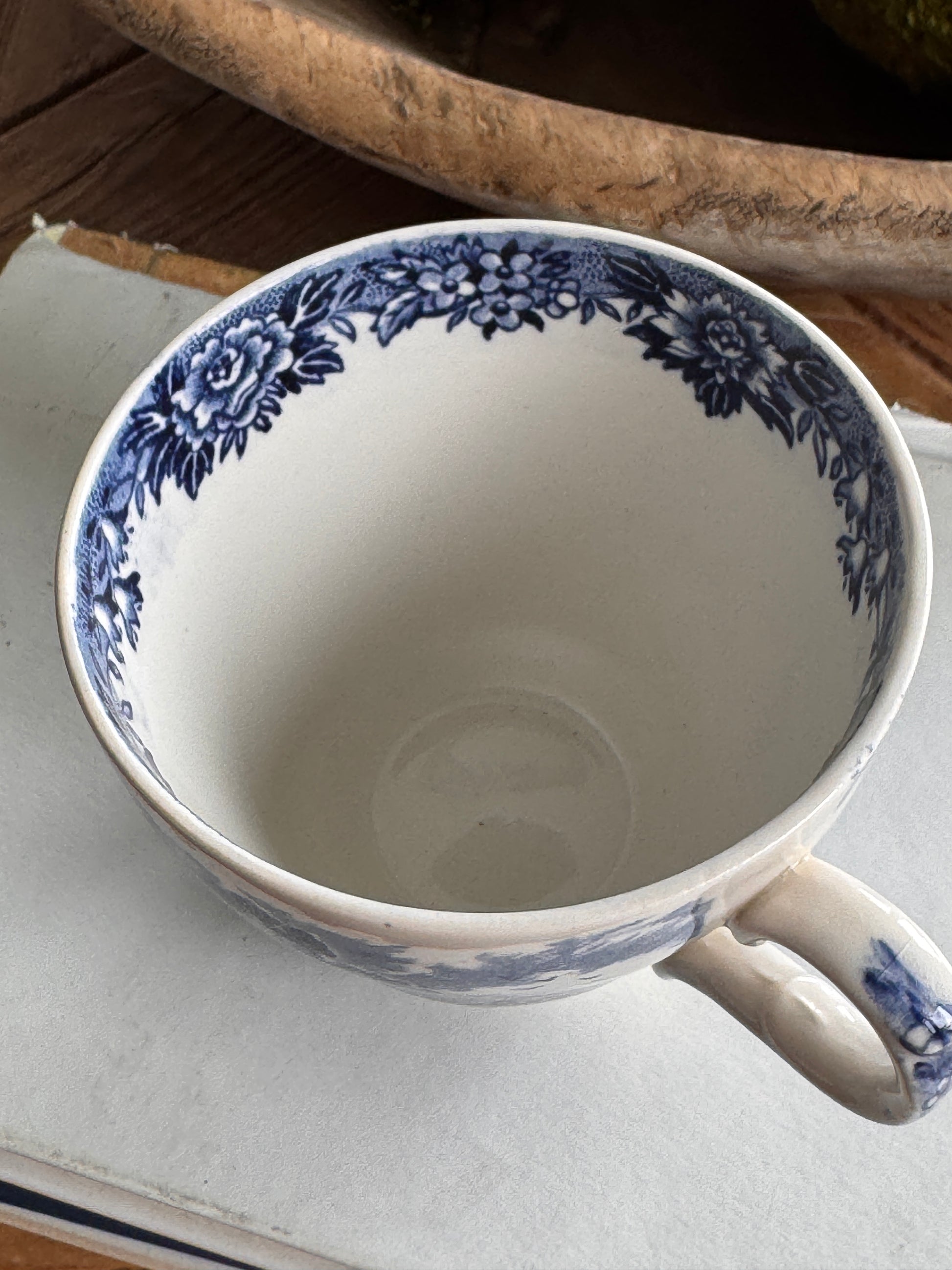 A classic blue and white transferware teacup featuring a detailed pastoral landscape, complete with cottage architecture, trees, and flowing water. The traditional form and timeless motif evoke slow mornings and well-worn traditions. Beautifully balanced and rich in character, this piece is ideal for display, daily ritual, or as part of a thoughtfully collected tableware assortment.